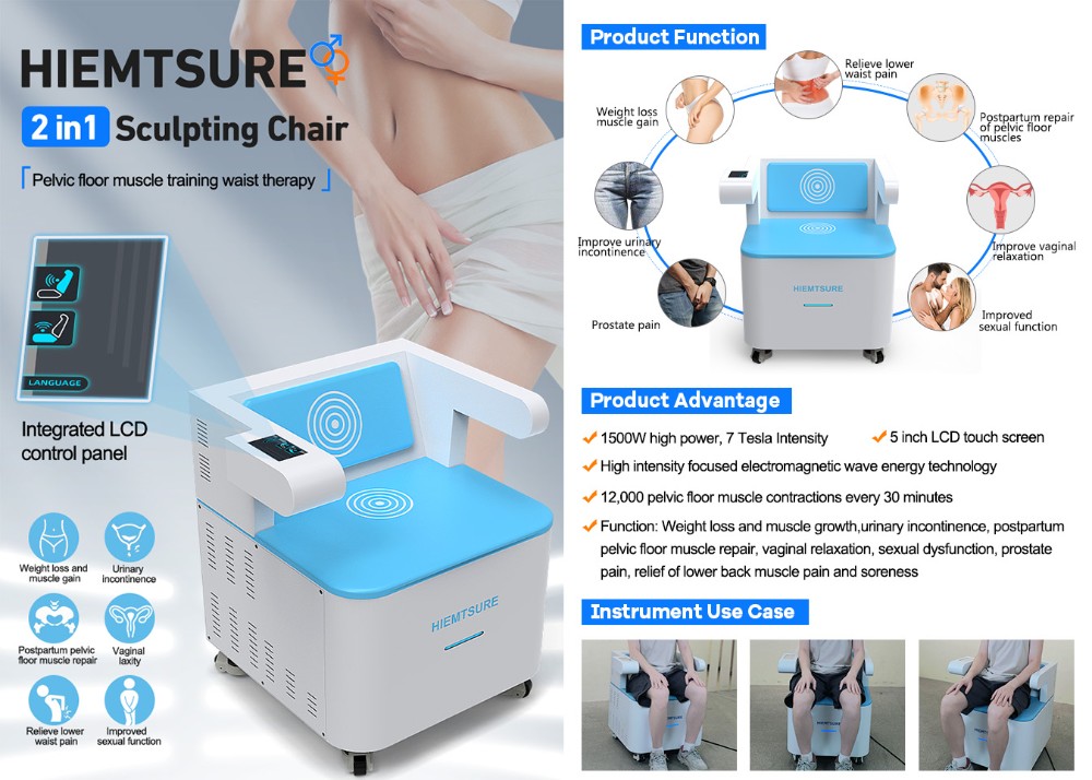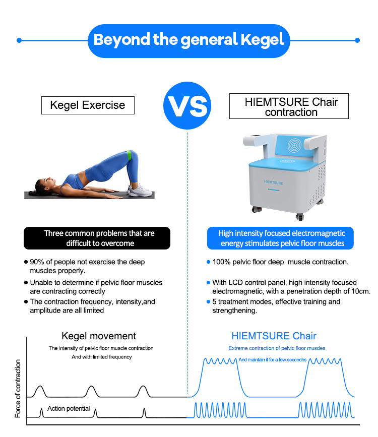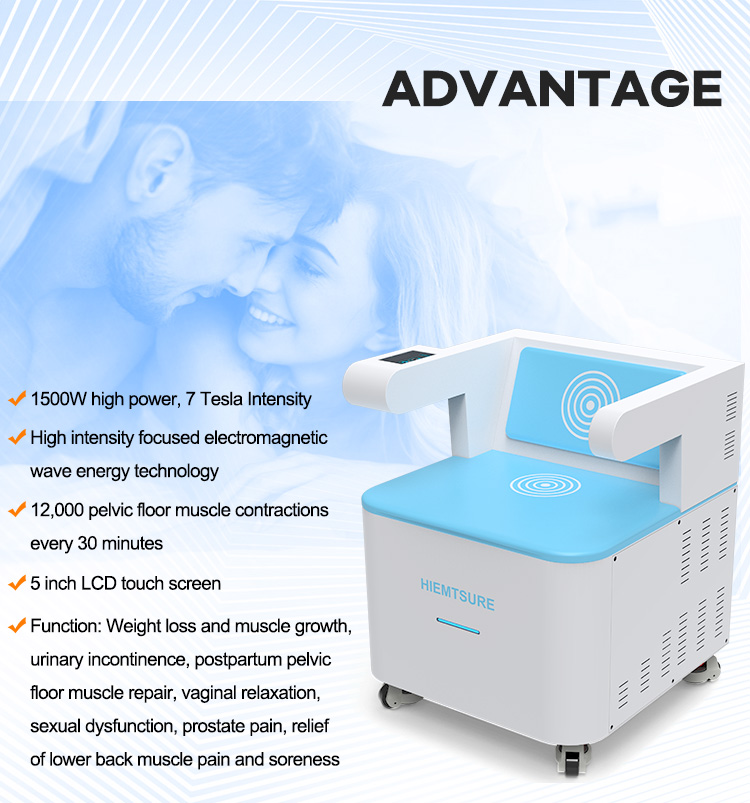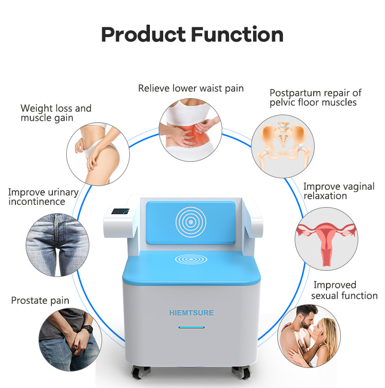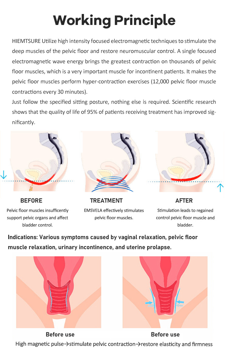 HIEMTSURE Utilize high intensity focused electromagnetic (HIFEM) techniques to stimulate the deep muscles of the pelvic floor and restore neuromuscular control. A single focused electromagnetic wave energy brings the greatest contraction on thousands of pelvic floor muscles, which is a very important muscle for incontinent patients. It makes the pelvic floor muscles perform hyper-contraction exercises (12,000 pelvic floor muscle contractions every 30 minutes).
