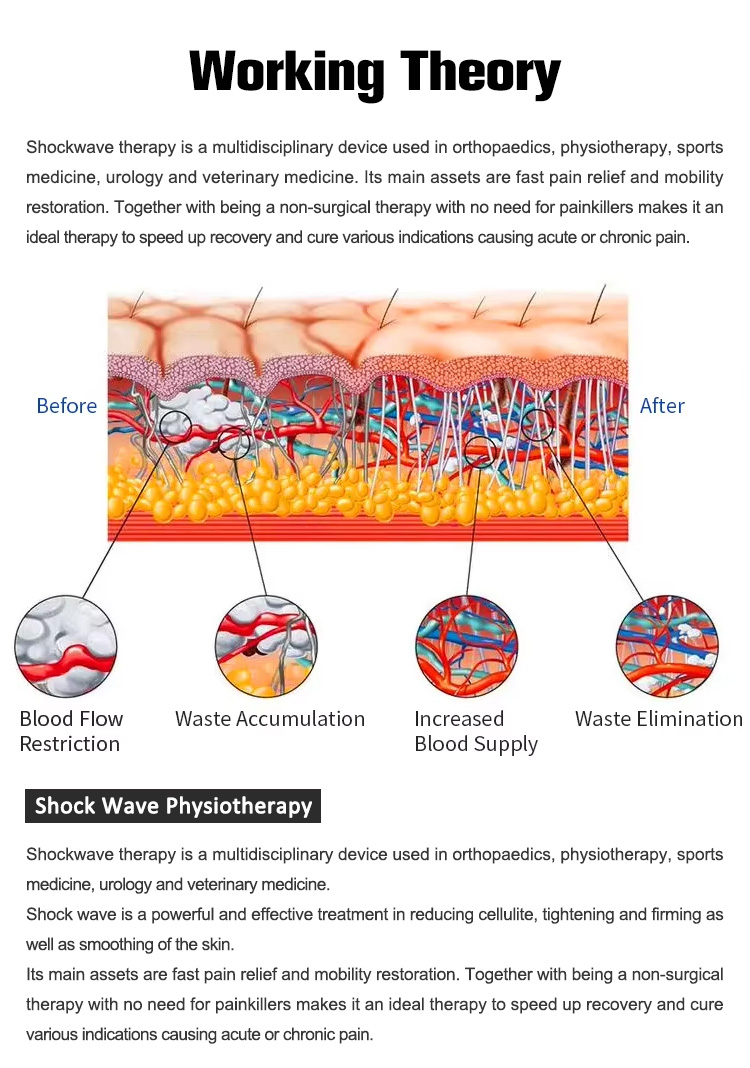 Shock wave is a powerful and effective treatment in reducing cellulite, tightening and firming as well as smoothing of the skin. Through the physical vibration of the precise delivery to the cellulite to break the stubborn cellulite, make it from thick to thin, targeting cellulite, promote metabolism, the excess fat out of the body, to achieve fat loss and weight loss results.
