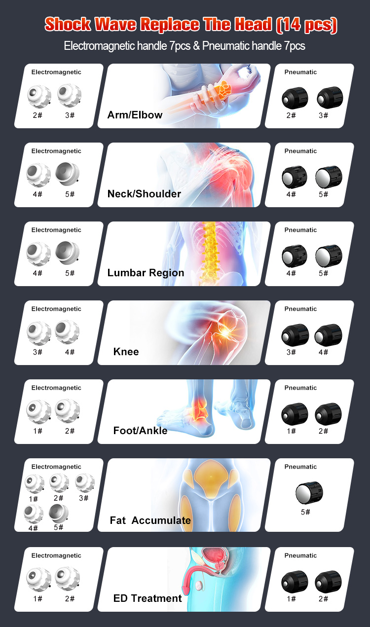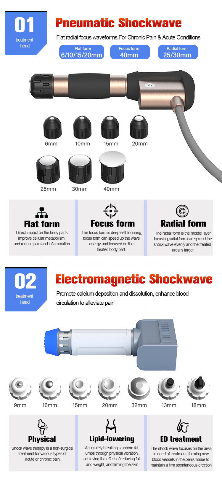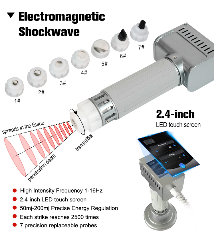 Electromagnetic shockwave: it is through a high-voltage capacitor to an inductive coil discharge, inductively generated electromagnetic field, electromagnetic field into kinetic energy to drive the handle of the bullet movement, the bullet impact on the working head to generate shock waves, shock waves through the human body tissue to reach the affected area.